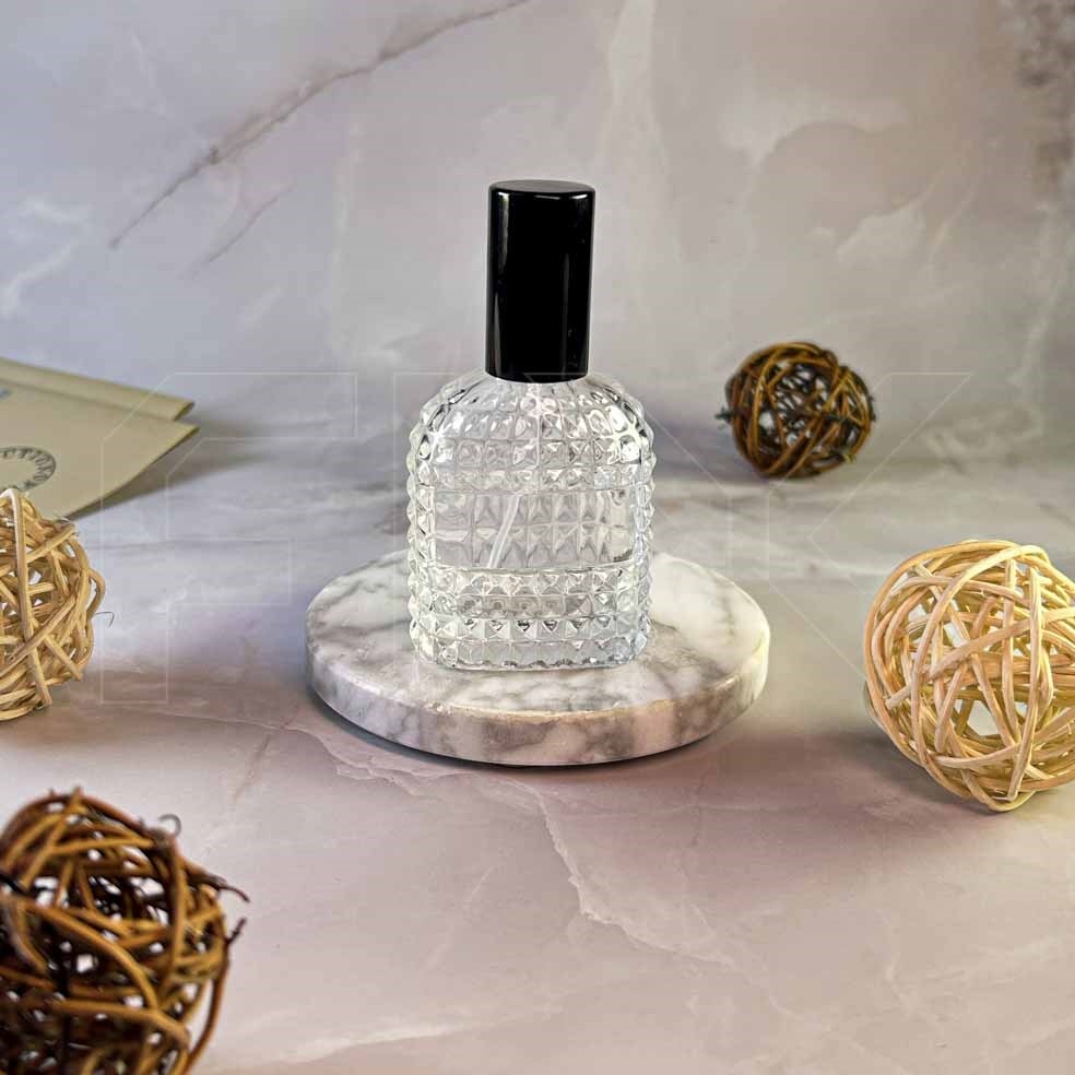 Объем: +-2мл. Атомайзер объемом 28 мл, выполненный из узорного стекла с черной металлической крышкой, представляет собой стильный и современный аксессуар для хранения ваших любимых ароматов. Уникальный узор на стеклянной поверхности добавляет визуальной привлекательности и оригинальности, делая его отличным акцентом в любой косметической коллекции.