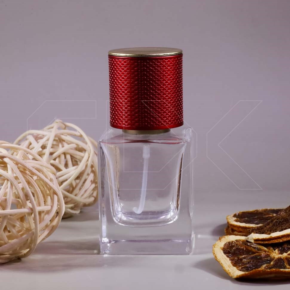 Прозрачное стекло позволяет легко контролировать уровень оставшейся жидкости, что удобно для пользователей парфюмерии, которые хотят быть уверенными в наличии любимого аромата. Красная пластиковая крышка обеспечивает надежное закрытие, предотвращая утечки и испарение содержимого, что особенно важно для сохранения качества парфюмерии.