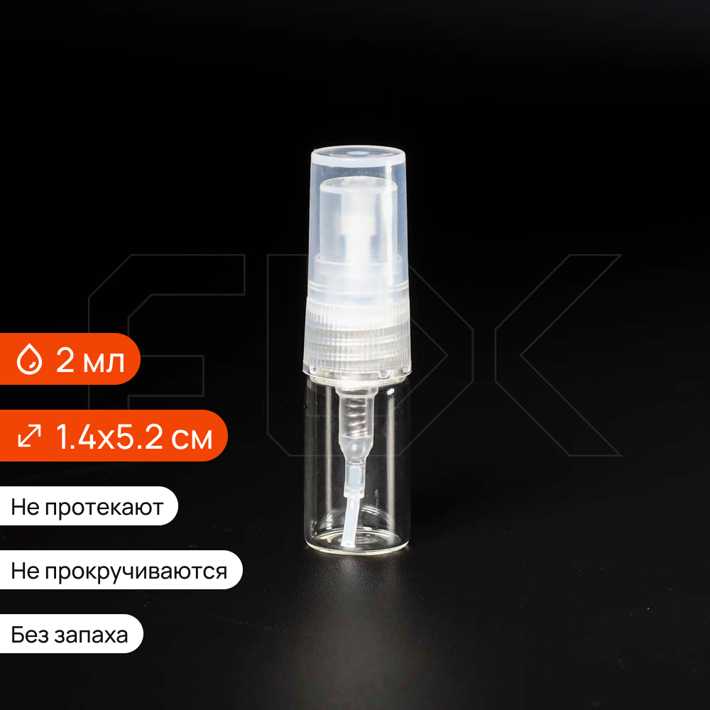 Объем: +-0.2мл. Прозрачный дорожный флакон из стекла, цилиндрической формы.