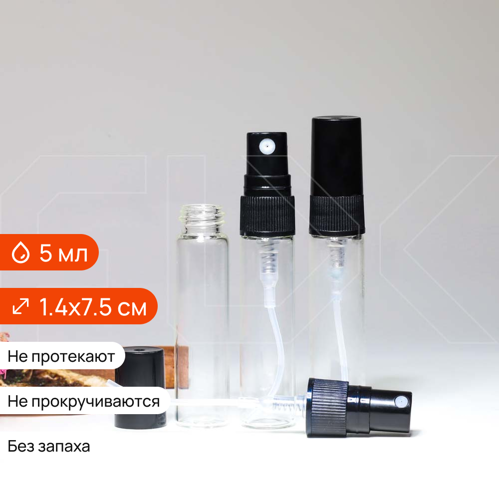 Объем: +-0.2мл. Прозрачный дорожный флакон из стекла, цилиндрической формы.