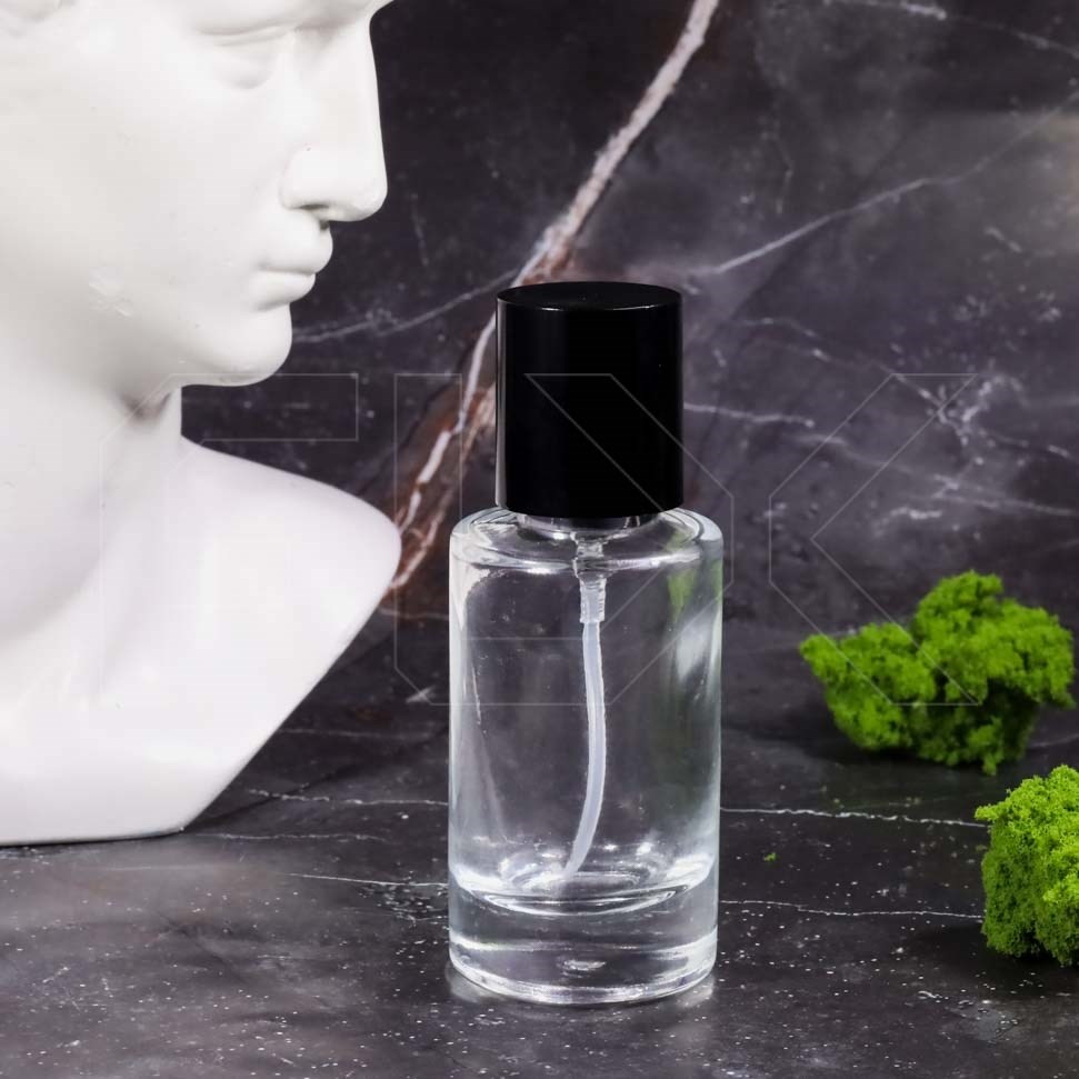 Прозрачное стекло позволяет легко контролировать уровень оставшейся жидкости, что удобно для пользователей, ценящих свои ароматы. Черная крышка надежно закрывает атомайзер, предотвращая утечки и испарение содержимого, а также придаёт ему современный вид.