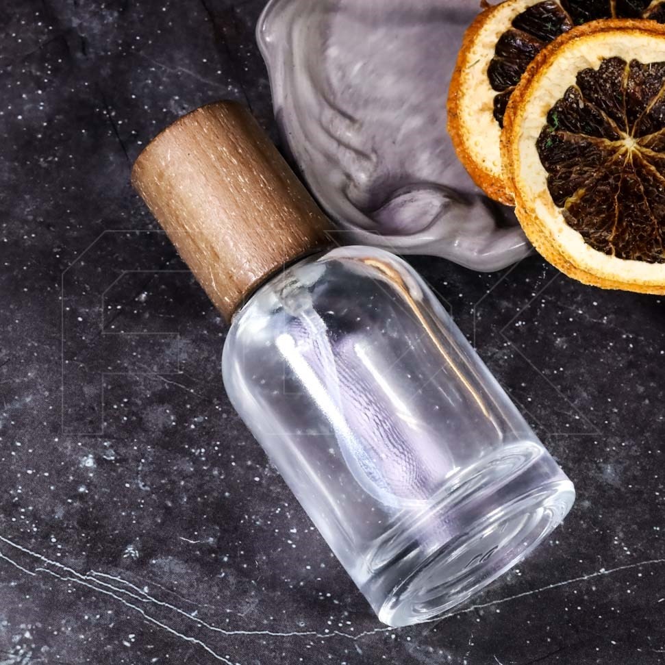Атомайзер объемом 30 мл выполнен из прозрачного качественного стекла с темной деревянной крышкой.